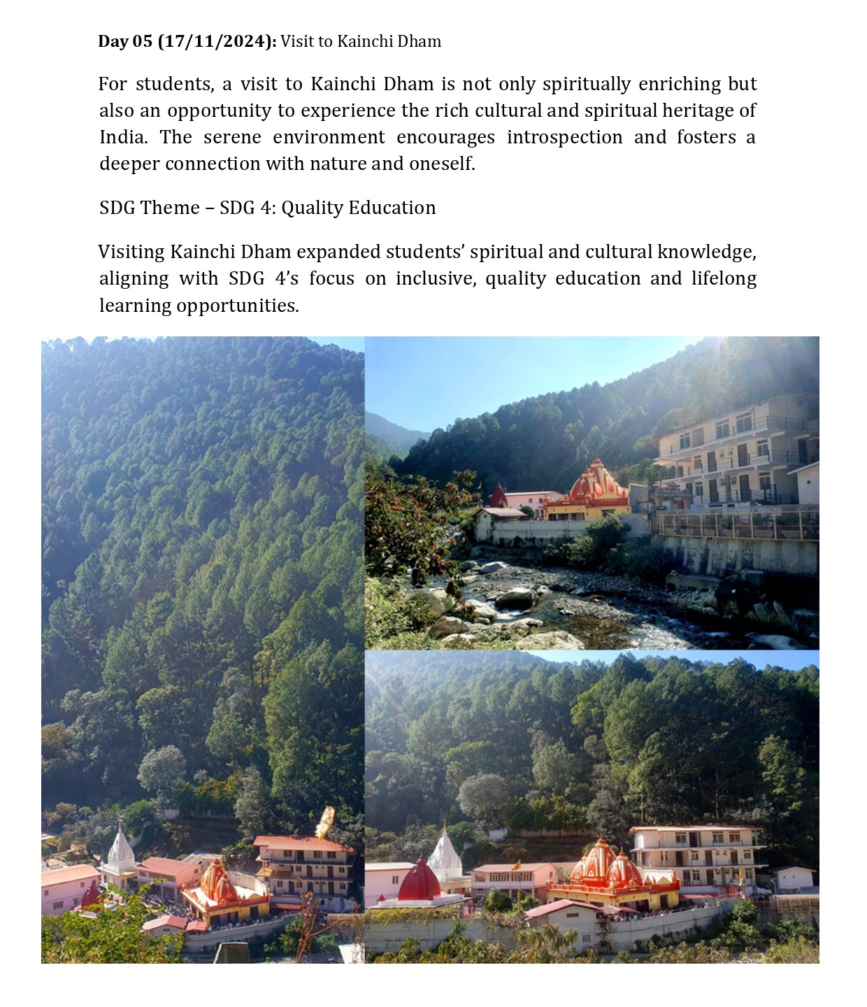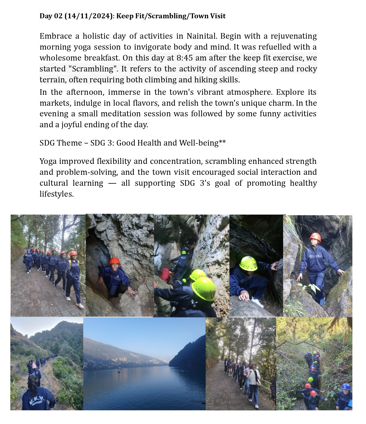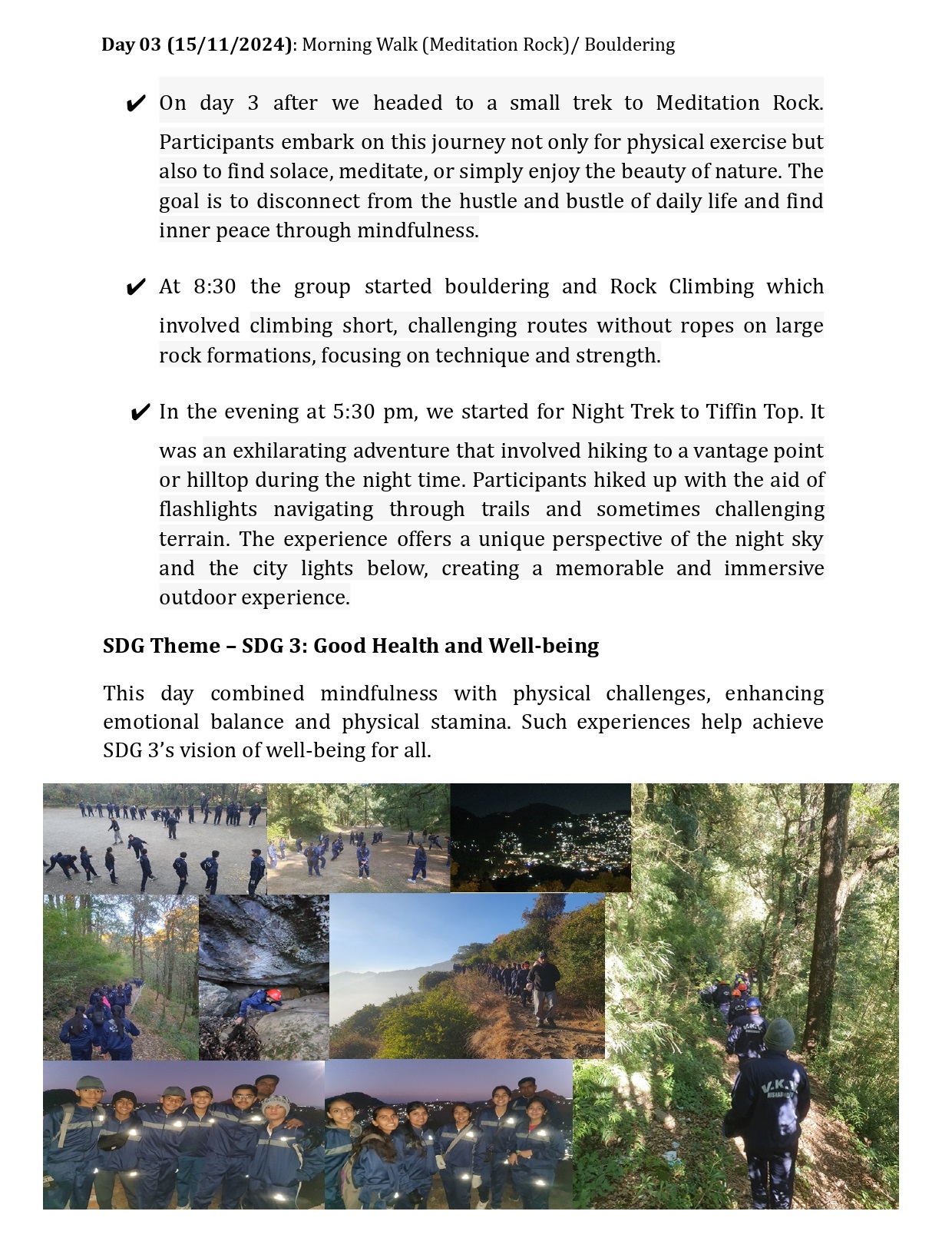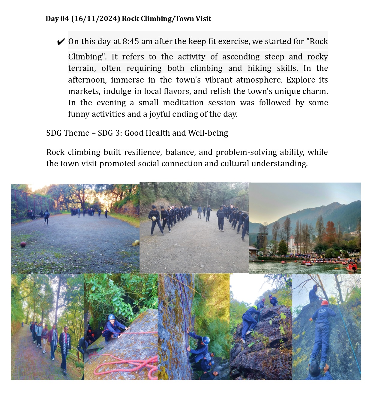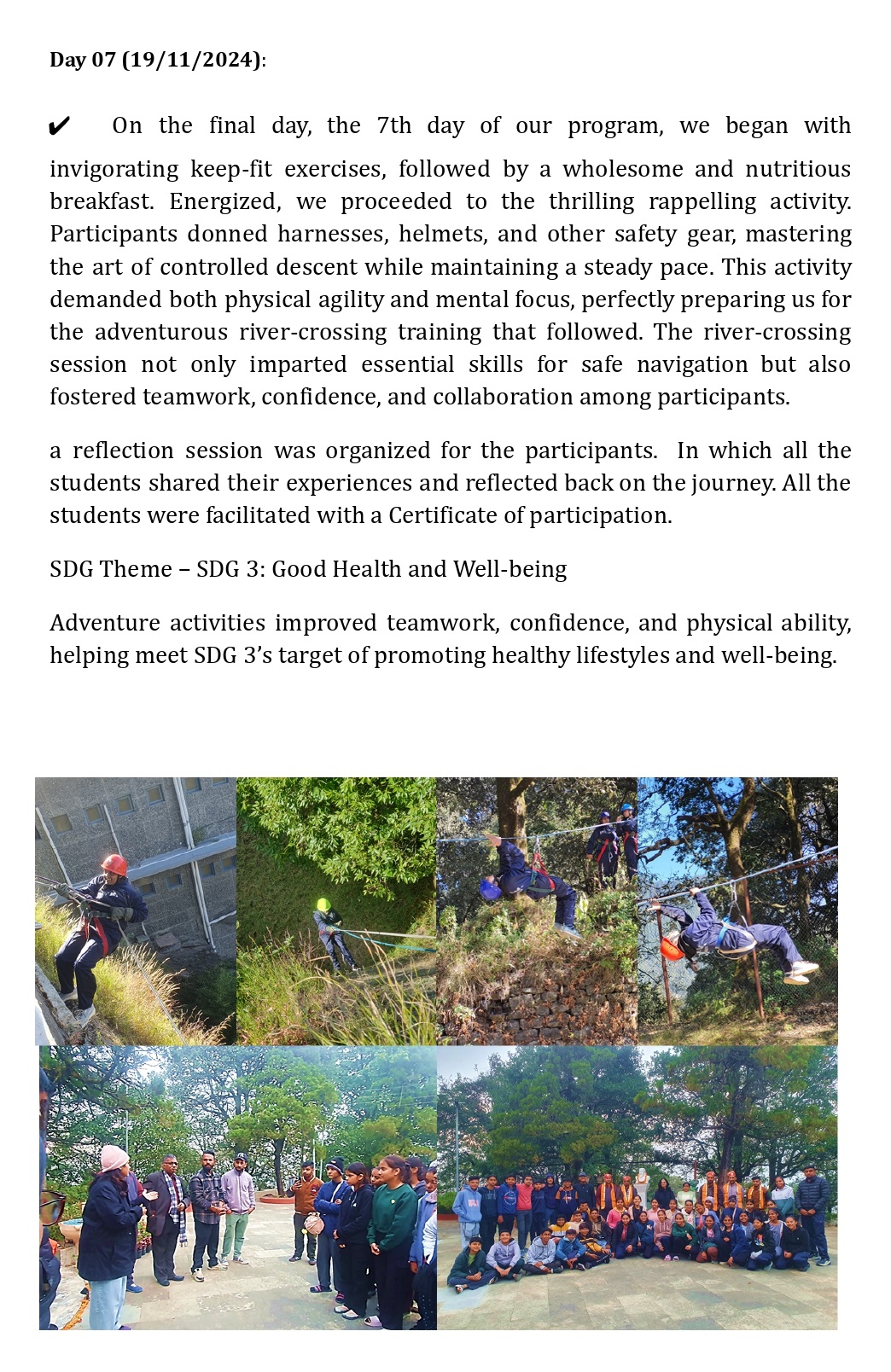 The Youth Camp reflected multiple Sustainable Development Goals. Physical and mental health were strengthened (SDG 3), cultural and spiritual education was enriched (SDG 4), and environmental awareness was deepened (SDG 15). Through trekking, meditation, cultural visits, and adventure sports, students experienced holistic development in harmony with the UN’s vision for a sustainable future.