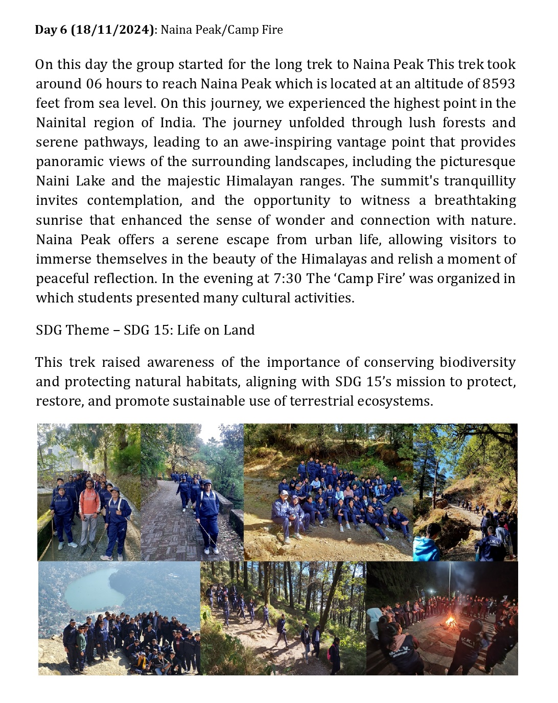 On this day the group started for the long trek to Naina Peak This trek took around 06 hours to reach Naina Peak which is located at an altitude of 8593 feet from sea level. On this journey, we experienced the highest point in the Nainital region of India. The journey unfolded through lush forests and serene pathways, leading to an awe-inspiring vantage point that provides panoramic views of the surrounding landscapes, including the picturesque Naini Lake and the majestic Himalayan ranges. The summit's tranquillity invites contemplation, and the opportunity to witness a breathtaking sunrise that enhanced the sense of wonder and connection with nature. Naina Peak offers a serene escape from urban life, allowing visitors to immerse themselves in the beauty of the Himalayas and relish a moment of peaceful reflection. In the evening A short session on’ Meditation and Growth Talk’ was organized. At night at 8:30 The ‘Camp Fire’ was organized in which students presented many cultural activities.