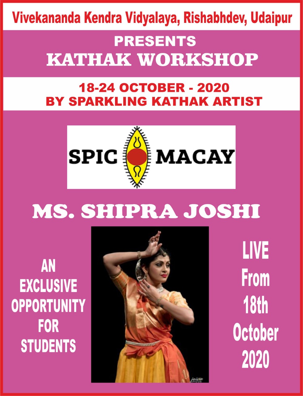 A one day Kathak Dance training programme was conducted in VKV, Rishabhdev School by Spic Macay Organisation. Famous Kathak Dancer Gauri Diwakar performed a breath taking dance presentation. She has been awarded with senior fellowship by Kalavahini Trust, Chennai this year. While in the year 2008, she was awarded with Ustad Bismillah Khan Yuva Puraskar by the Sangeet Natak Akadami. She was accompanied by Mohit Gangani on Tabla, Aashish Gangani on Pakhawaj, Faraz Ahmed on Vocal and Harmonium.